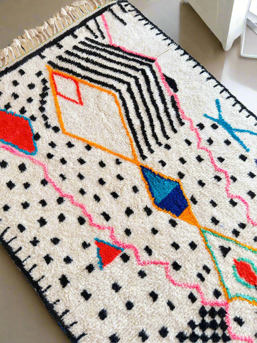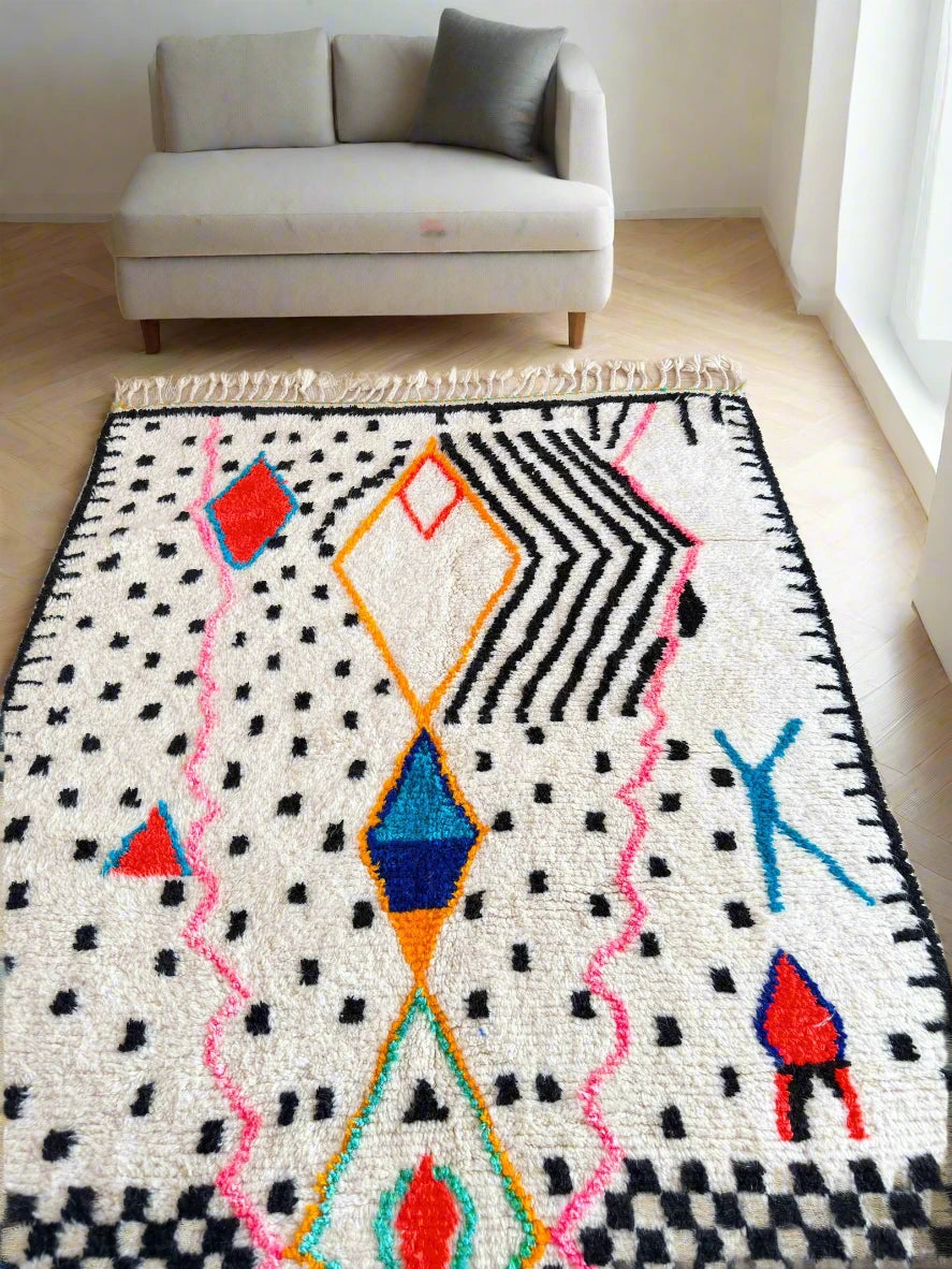 Our rugs are 100% authentic Moroccan rugs and have been hand selected for their quality and style. they are made entirely of natural wool. Moroccan Berber rugs are notable for their natural lively colors, which makes them a great choice to tie in with most color schemes.